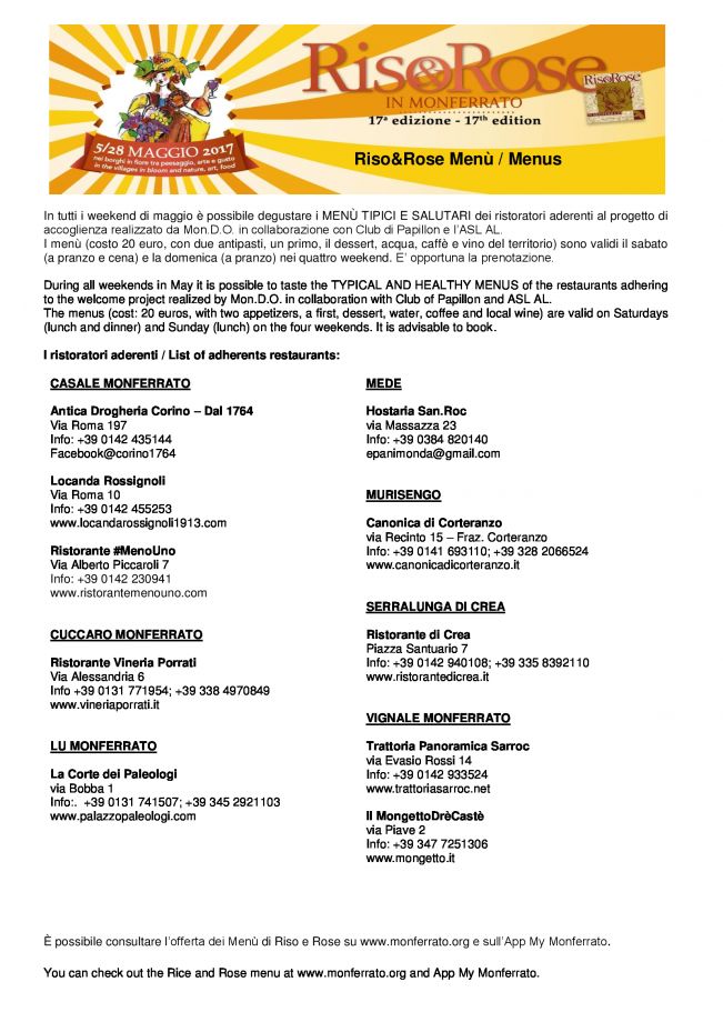 During all weekends in May it is possible to taste the TYPICAL AND HEALTHY MENUS of the restaurants adhering to the welcome project realized by Mon.D.O. in collaboration with Club of Papillon and ASL AL.