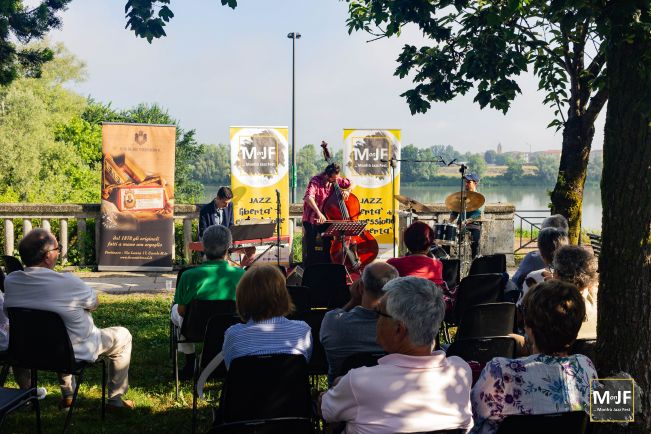Il concerto non ha potuto svolgersi come d’abitudine all’imbarcadero con la colazione monferrina preparata dagli amici del Po, a causa della recente ondata di maltempo, ma l’affaccio sul grande fiume dal Lungo Po animato dalle bancarelle, ha reso comunque molto suggestivo il momento musicale offerto da Nugara Trio Francesco Negri, piano, Viden Spassov contrabbasso e Francesco Sparsi batteria. I tre musicisti sono amici di vecchia data del Fest, in quanto con il loro album di debutto Point of Convercency finanziato dal bando di Nuovo Imaie sono reduci da un tour che oltre che in Europa li ha portati in giro per l’Italia. Ora sono pronti a spargere nuovamente la loro musica in giro per il mondo (li attende un concerto anche in Cina) con il loro secondo disco che hanno presentato proprio domenica a Casale "The Last Question". Il Tour è un progetto Le Muse Accademia Europea d’Arte nell’ambito del Monfrà Jazz Fest con il sostegno del MiC e di SIAE nell’ambito del programma “Per Chi Crea”.