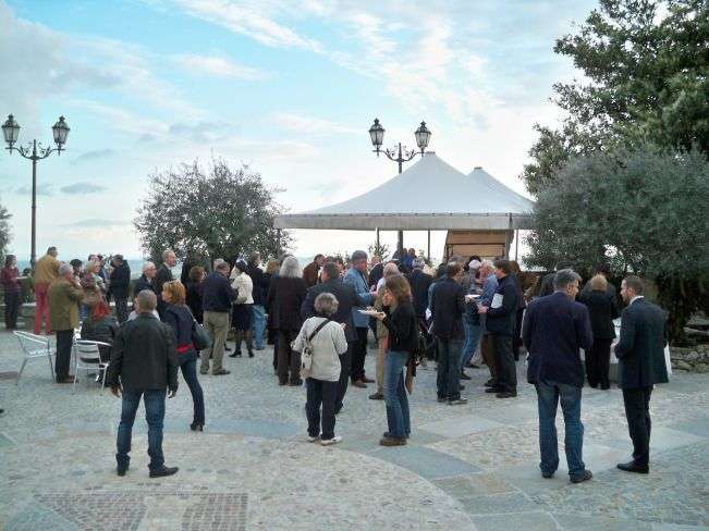 Un momento dell'aperitivo con degustazione a cura di Cascina Martini, sullo sfondo del borgo di Murisengo e di un panorama infinito di colline.