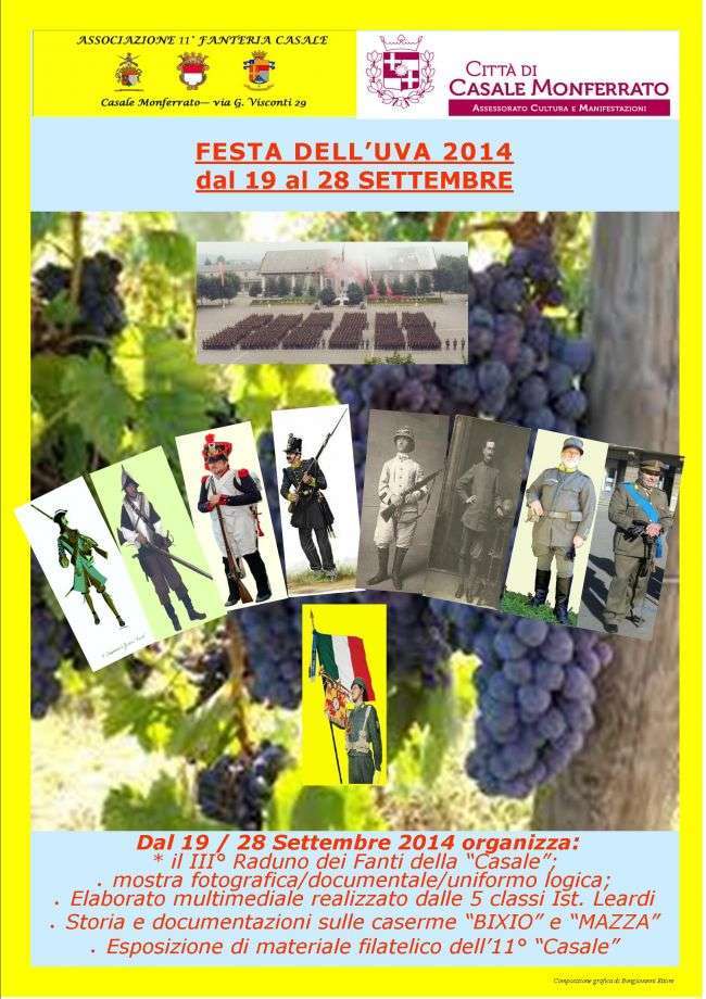 Dal 19 al 28 settembre l’Associazione 11° Fanteria Casale e l’Assessorato cittadino alla Cultura organizzano una mostra storica, fotografica, documentale e uniformologica dal titolo L'11° dal 1946 al 1998. La mostra, che si terrà nei locali della Manica del Castello, sarà inaugurata il giorno 19 settembre alle ore 16,30 con la presenza dell’assessore Daria Carmi. Gli orari di apertura saranno sabato e domenica dalle ore 10,00 alle 19,00.