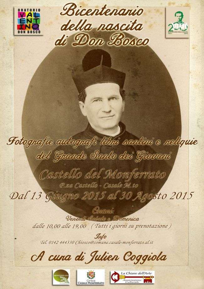 Sarà inaugurata venerdì 12 giugno alle 18,30 una ricca e interessante mostra dedicata interamente a San Giovanni Bosco, che troverà collocazione negli spazi espositivi del Castello fino al 30 agosto. L’iniziativa si inserisce nel nutrito programma di manifestazioni ed eventi relativi ai festeggiamenti per il Bicentenario della nascita di san Giovanni Bosco, che si celebra quest’anno e culminerà il 16 agosto 2015.