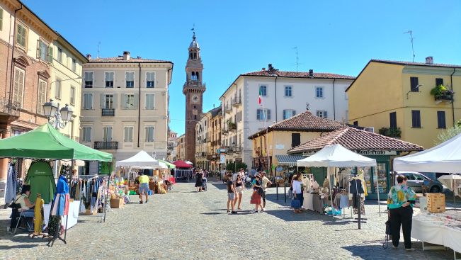 Nella foto: Via Saffi in occasione del Mercatino DOC Monferrato Tipico e Shopping (ph. credit Ufficio IAT Informazioni Turistiche di Casale Monferrato, foto d'archivio)