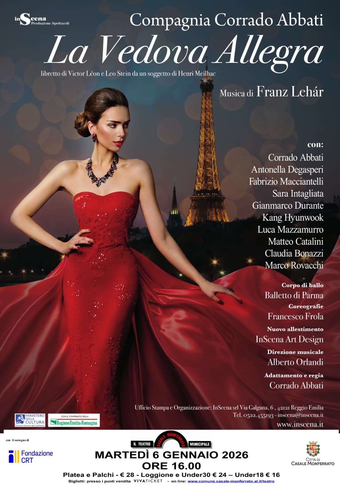 L’operetta “La Vedova Allegra” è in programma martedì 6 gennaio 2026 alle ore 16,00: ispirata al concetto di “leggerezza” di Calvino, questa edizione de La Vedova Allegra propone un allestimento fedele allo spirito dell’operetta, con musica di Franz Lehár, coreografie di Francesco Frola, regia e adattamento di Corrado Abbati, direzione musicale di Alberto Orlandi e il Balletto di Parma, privilegiando ritmo, eleganza e interazione con il pubblico.