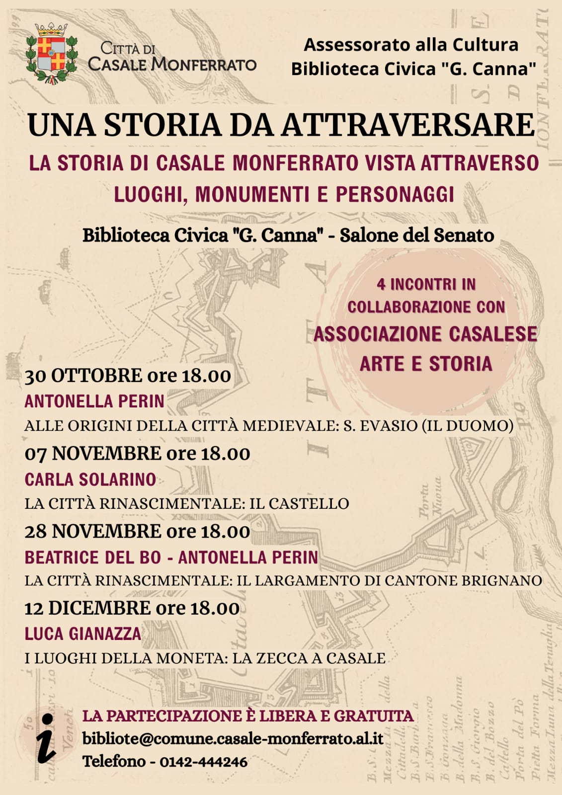 L’iniziativa, frutto della collaborazione tra la Biblioteca Civica e l’Associazione casalese Arte e Storia, si articolerà in quattro appuntamenti che, attraverso luoghi-simbolo del paesaggio urbano, proporranno un viaggio nella storia di Casale Monferrato dal Medioevo all’età moderna.