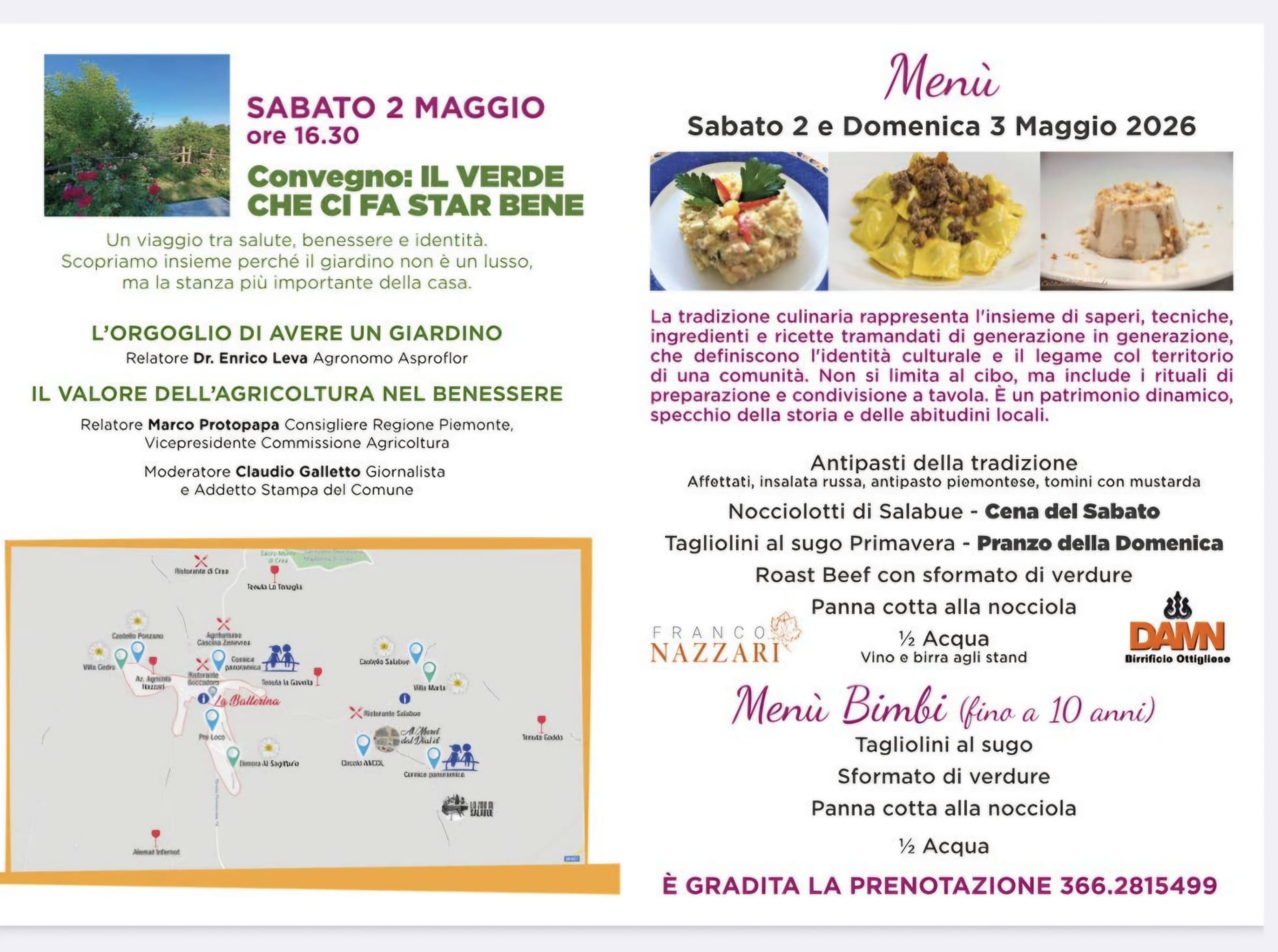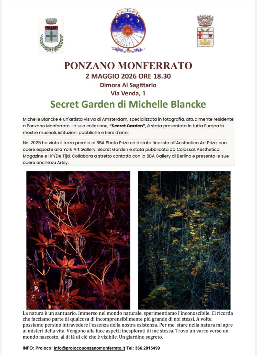 Gli eventi avranno inizio nel pomeriggio di sabato 2 maggio con l’ormai consueto incontro per riflettere con esperti sui temi legati al giardino, l’agricoltura e l’accoglienza. Quest’anno il tema di dibattito sarà “Il verde che ci fa star bene”, ossia un “viaggio tra salute, benessere e identità” che porterà i presenti a “scoprire perché il giardino non è un lusso ma la stanza più importante della casa”. Se ne parlerà dalle ore 16.30 presso la Sala Consiliare del Municipio di Ponzano insieme all'agronomo e tecnico Asproflor Enrico Leva che approfondirà il focus “L’orgoglio di avere un giardino” mentre successivamente il consigliere della Regione Piemonte Marco Protopapa (vicepresidente della Commissione Agricoltura) si concentrerà sul tema “Il valore dell’agricoltura nel benessere”. Dalle riflessioni si passerà subito dopo all’arte della fotografia con l'inaugurazione alle ore 18, presso la Dimora Al Sagittario di via Venda 1, dell’esposizione “Secret Garden” a cura dell’artista visiva olandese Michelle Blancke. L’autrice da Amsterdam ha scelto le colline di Ponzano Monferrato per risiedere e in questa occasione presenterà alcuni capolavori della sua collezione dedicata proprio al tema del giardino e presentata in tutta Europa attraverso fiere d’arte, istituzioni pubbliche e mostre museali. Michelle ha vinto nel 2025 il terzo premio al BBA Photo Prize collaborando anche con la BBA Gallery di Berlino ed esponendo alla York Art Gallery. Il giardino secreto, secondo l’artista, è un varco verso un mondo nascosto, verso i misteri della vita che stanno al di là di ciò che è visibile nella natura. Le sue opere saranno visitabili al momento dell’inaugurazione e durante la giornata di domenica, nell’orario di apertura dei giardini ponzanesi. La serata di sabato continuerà successivamente con la distribuzione di specialità gastronomiche dalle 19.30 presso la Pro loco di Ponzano Monferrato in piazza Unità d’Italia dove, dalle 21 avrà inizio l’intrattenimento musicale con “Emozioni Band”. Particolare attenzione è rivolta alle proposte gastronomiche della serata di sabato e del pranzo della domenica con un menù che tende a valorizzare le tipicità ponzanesi e in particolare le Denominazioni Comunali del territorio. Sia per la cena del sabato che per il pranzo della domenica si potranno gustare gli antipasti della tradizione come Affettati, Insalata Russa, Antipasto Piemontesi, Tomini con Mustarda, Roast Beef con Sformato di Verdure, Panna Cotta alla Nocciola mentre il sabato saranno anche disponibili i Nocciolotti di Salabue e la domenica i Tagliolini al Sugo di Primavera. È disponibile anche un menù bambini con Tagliolini al Sugo, Sformato di verdure e Panna Cotta alla Nocciola con acqua. Saranno inoltre presenti il sabato e la domenica le postazioni dell’azienda Franco Nazzari che serviranno vini monferrini e del Birrificio Ottigliese con le proprie birre. I pasti sono prenotabili anticipatamente fino ad esaurimento delle disponibilità.