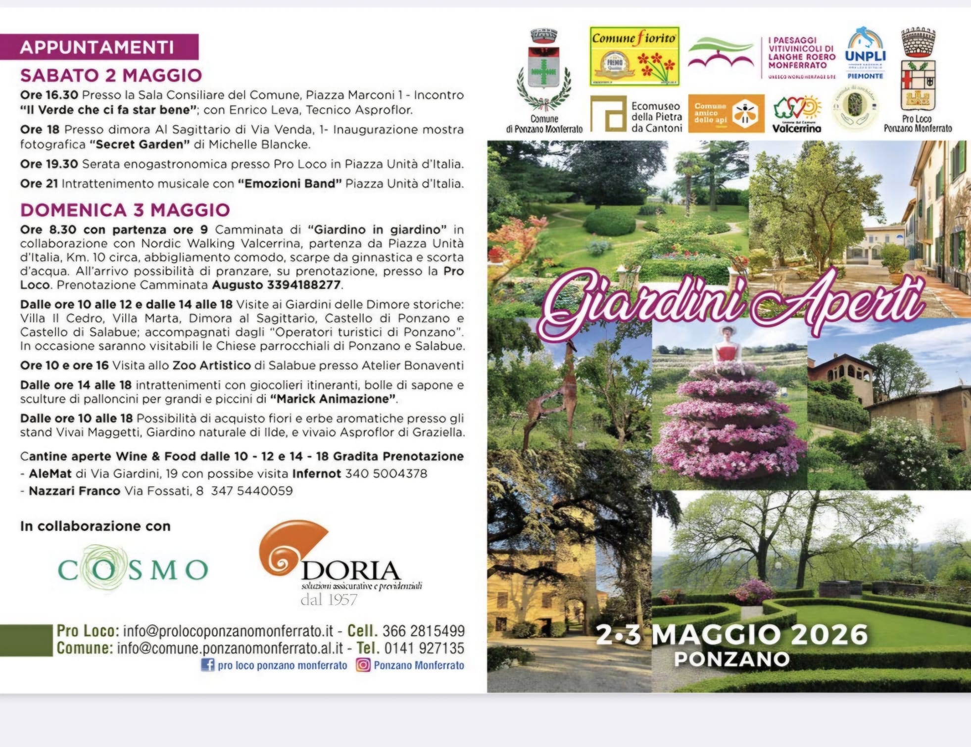 “’Giardini Aperti’ è senza dubbio l’occasione per mettere in mostra ai visitatori il meglio di Ponzano Monferrato – è il commento del sindaco di Ponzano Monferrato Paolo Lavagno – ed è grazie ai titolari dei Castelli e delle Ville, agli operatori turistici volontari, alla Pro Loco, a tutti i collaboratori e protagonisti degli eventi e alle aziende partecipanti se l’evento può essere così rappresentativo del nostro territorio. Invito tutti – monferrini e turisti provenienti da fuori zona – a cogliere questa opportunità trattenendosi a Ponzano per l’intero weekend approfittando delle tante bellezze e bontà che la manifestazione e il paese presentano.”
