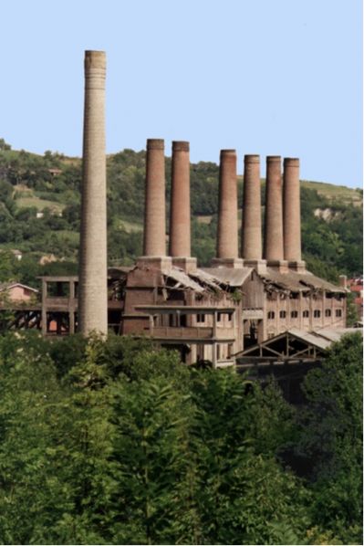 La cementeria ex Milanese & Azzi, ora di proprietà della Società Italcementi, nacque su precedenti insediamenti per la produzione della calce idraulica. I sei forni verticali da cemento sistema Dietsch ne sono la parte più eclatante. Nel 1924 tra le due batterie di forni venne inserita la stazione di arrivo della teleferica dalle miniere di Coniolo e Rolasco.